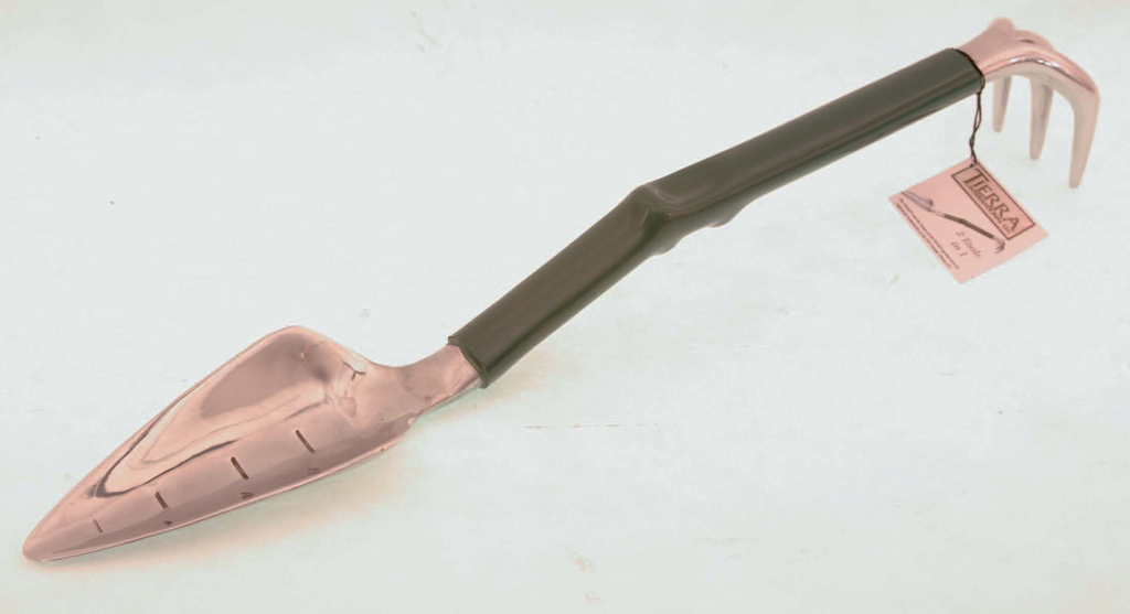The Trake garden tool is a recognized everywhere by its sleek, elegant, and remarkably unique shape. It is the ultimate gardening tool. The Trake combination trowel and rake features two useful tools in one and a lengthy 17 inch handle so it can be used kneeling or sitting, eliminating extra bending and back strain.